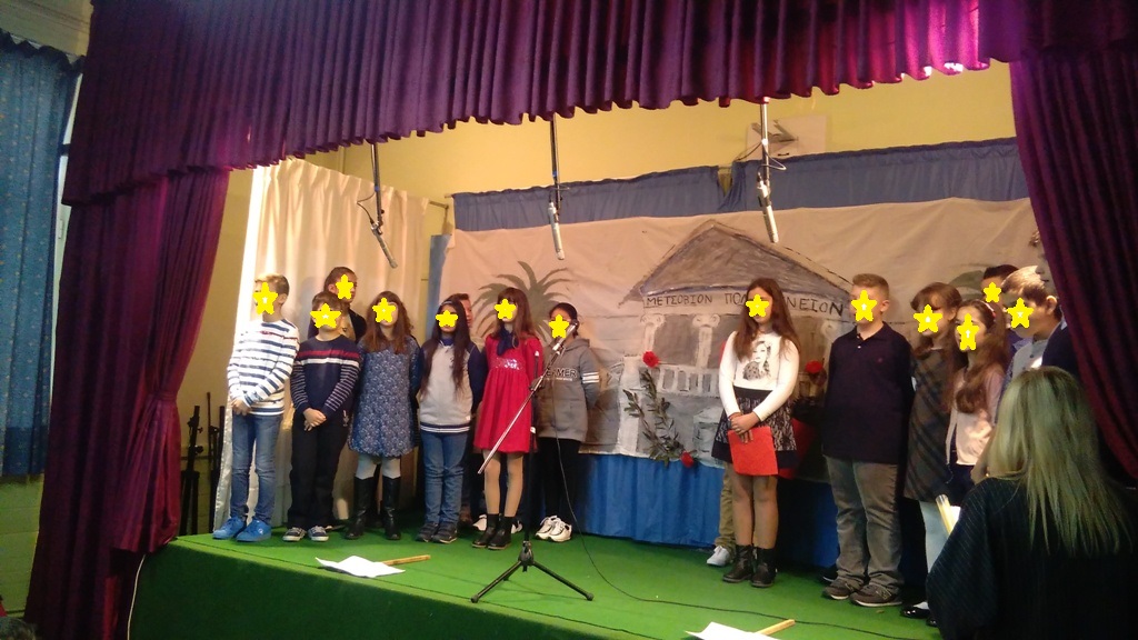 Κάθε χρόνο, στα σχολεία προετοιμαζόμαστε για διάφορες εκδηλώσεις, με σκοπό να τιμήσουμε την εξέγερση και το συμβολισμό του Πολυτεχνείου. Έτσι και φέτος, οι μαθητές της Ε΄ τάξης του σχολείου μας παρουσίασαν το χρονικό των γεγονότων της εξέγερσης, απήγγειλαν ποιήματα, τραγούδησαν τραγούδια και συγκίνησαν τους μαθητές και τους γονείς που παρακολούθησαν τη γιορτή.
